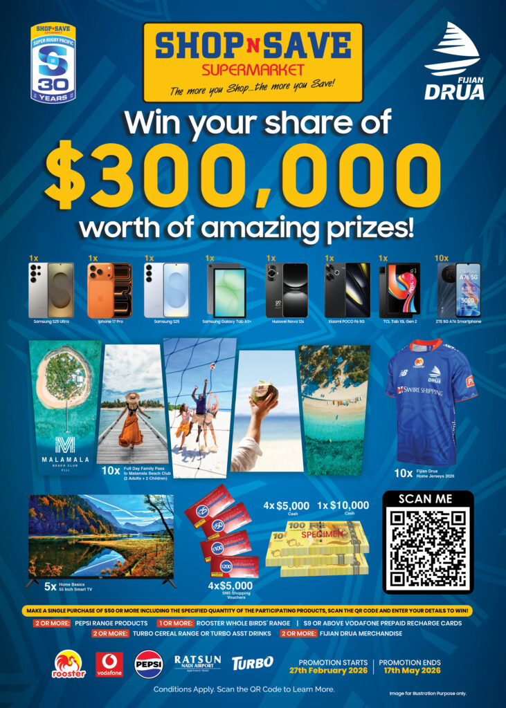 Published by admin on February 26, 2026 Categories Tags SNS Drua Promotion 2026 Full Name * Address * Email Address (optional) Phone Number * Receipt Number * Upload Receipt * Accepted formats: JPEG, PNG, GIF. Maximum size: 5MB. Terms & Conditions Terms and Conditions: Your entry into and participation in the promotion with Shop N Save Supermarket (Promoter) is deemed acceptance of these Terms and Conditions which includes any, but not limited to; information on how to enter, draw dates and the prizes. Who can enter? Entry is open to Fiji residents over the age of 18 years. The promotion commences on Friday 27th February, 2026 and ends on Sunday, 17th May 2026. All entries must be made during the period of the promotion. How to enter - Participants can enter the promotion through the following method on a single receipt valued at $50.00 or more Purchase 2 of Pepsi 330ml, 600ml, 1L or 2L, any Rooster whole birds or $9 and above Vodafone or Inkk prepaid recharge cards 2 or more SNS Turbo cereal range or Turbo Muesli 2 or more SNS Turbo Coconut water 500ml or Turbo Basil Seed Drink Range 290ml or Assorted Turbo Fruit Drink range 600ml, Any Fijian Drua Merchandise from Shop N Save Supermarket scan provided QR code – available on receipts, posters and on Shop n Save Supermarket enter your details to qualify to go into the draw to win selected weekly prizes. An eligible single receipt can only be used once and will only be entered once. Neither the Promoter, Sponsors nor any other entity associated with this promotion/sponsors will be responsible for any late, lost, misdirected, corrupted, incomplete or incorrectly submitted entries. Entries are deemed to be submitted at the time of receipt by Shop N Save Supermarket Promotions platform Participants are responsible for all costs associated with their respective entry including but not limited to internet access or other telephone charges. You may enter the Promotion multiple times, provided you follow the rules of ‘How to enter” for each entry and on separate correct receipt. Prize draw date: March – 9th,10th,16th,23rd,30th, April – 6th, 13th, 14th, 20th, 27tth, May – 4th, 11th, 18th (Major Draw) 2026. The winners will be randomly drawn from Shop N Save Supermarket Promotions platform in the presence of Shop N Save staff and Police Officer(s). All Senior Management, Media and Marketing personal of Shop N Save and their associated companies are not eligible to participate in this Promotion. Refer to the Shop N Save Facebook page and Shop N Save Supermarket Promotions platform for the full terms & conditions. Participants agree to receive email updates, event information and exclusive offers from Shop N Save Supermarket. Winner of Chartered cruise will have the option to take a buddy and will share room on board the chartered cruise. The Chartered cruise date is confirmed for 16th – 18th October, 2026 and should a winner be not available to take the trip can at will nominate another guest, winner will need to advise the promoter 10 working days in advance. The value of the charted cruise will not be exchange in cash The promoter will bear the cost of Accommodation / Meals and Transport for winners of the Chartered cruise residing outside of Nadi / Lautoka. Age verification will be required Child pass for Malamala Beach Club and must be below 15. Winner will be expected to fill and sign a form indemnifying the promotor of any and all losses, injuries and/or liability. I have read and agree to the Terms & Conditions * I agree to receive email updates, event information and exclusive offers from Shop N Save Supermarket Submit Entry Share0 admin